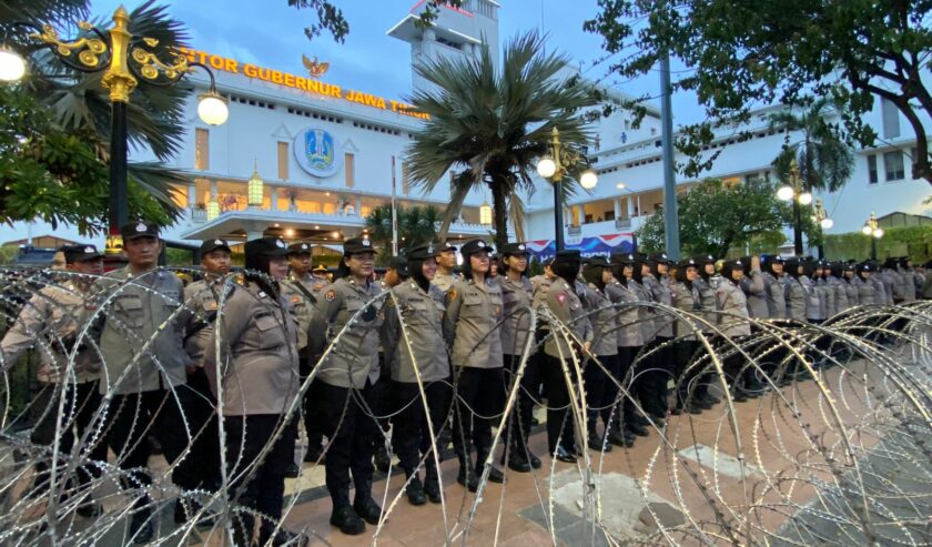 Polrestabes Surabaya mengerahkan 2.608 personel gabungan untuk mengamankan aksi demo hari ini dari kelompok buruh yang tergabung dalam Konfederasi Serikat Pekerja Indonesia (KSPI), Kamis (28/8/2025).