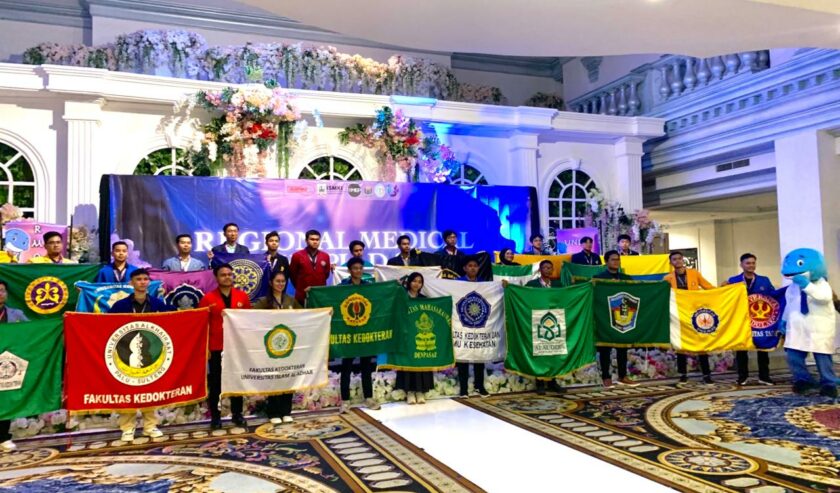 Para peserta yang tengah membawa bendera dari masing-masing kampusnya di Kegiatan Olimpiade Kedokteran Regional Medical Olympiad (RMO) yang dilaksanakan 1-5 Oktober di Ballroom Grand Empire Palace, Surabaya. Foto: Humas Unusa