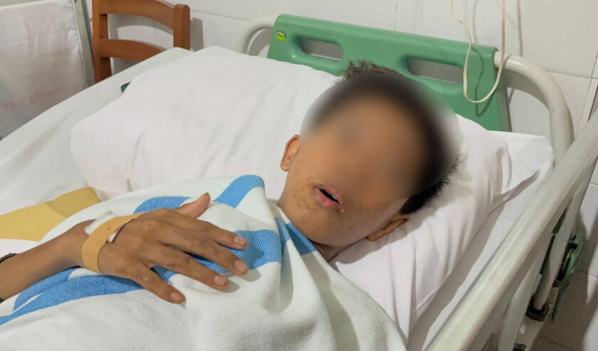 Syaifur Rosi (14 tahun) korban tertimpa reruntuhan musala Ponpes Al Khoziny ambruk yang baru dievakuasi dihari ketiga pencarian lalu telapak kaki kanan diamputasi, Kamis (2/10/2025). Foto: Meilita Elaine suarasurabaya.net