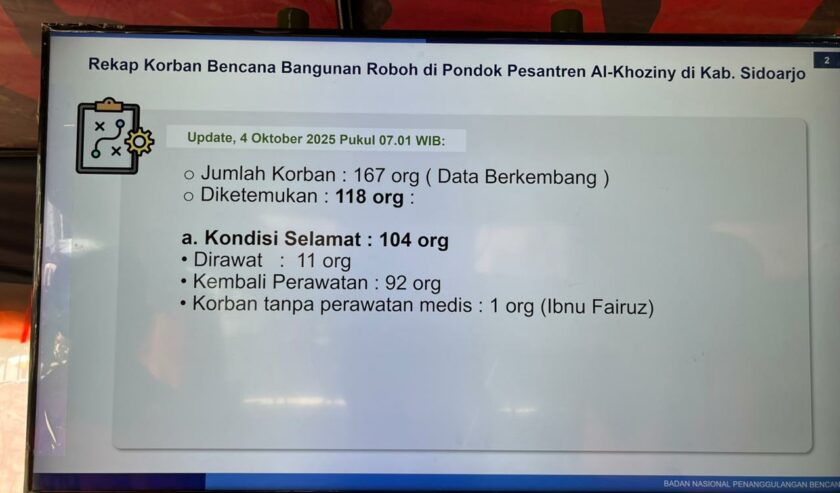 Rekap data sementara korban ambruknya musala Ponpes Al Khoziny di Buduran Sidoarjo hari keenam pencarian, Sabtu (4/10/2025). Foto: Meilita Elaine suarasurabaya.net