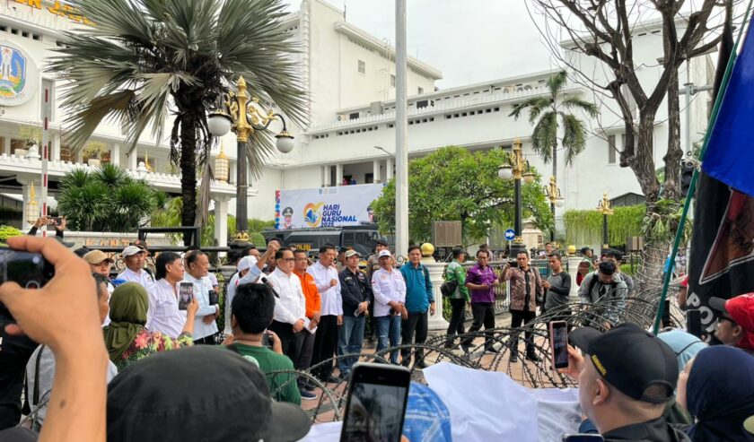 Ribuan massa aksi buruh yang menuntut kenaikan Upah Minimum Provinsi (UMP) di Kantor Gubernur Jawa Timur (Jatim), akhirnya ditemui Adhy Karyono Sekretaris Daerah Provinsi (Sekdaprov) Jatim pada, Kamis (27/11/2025) sore.