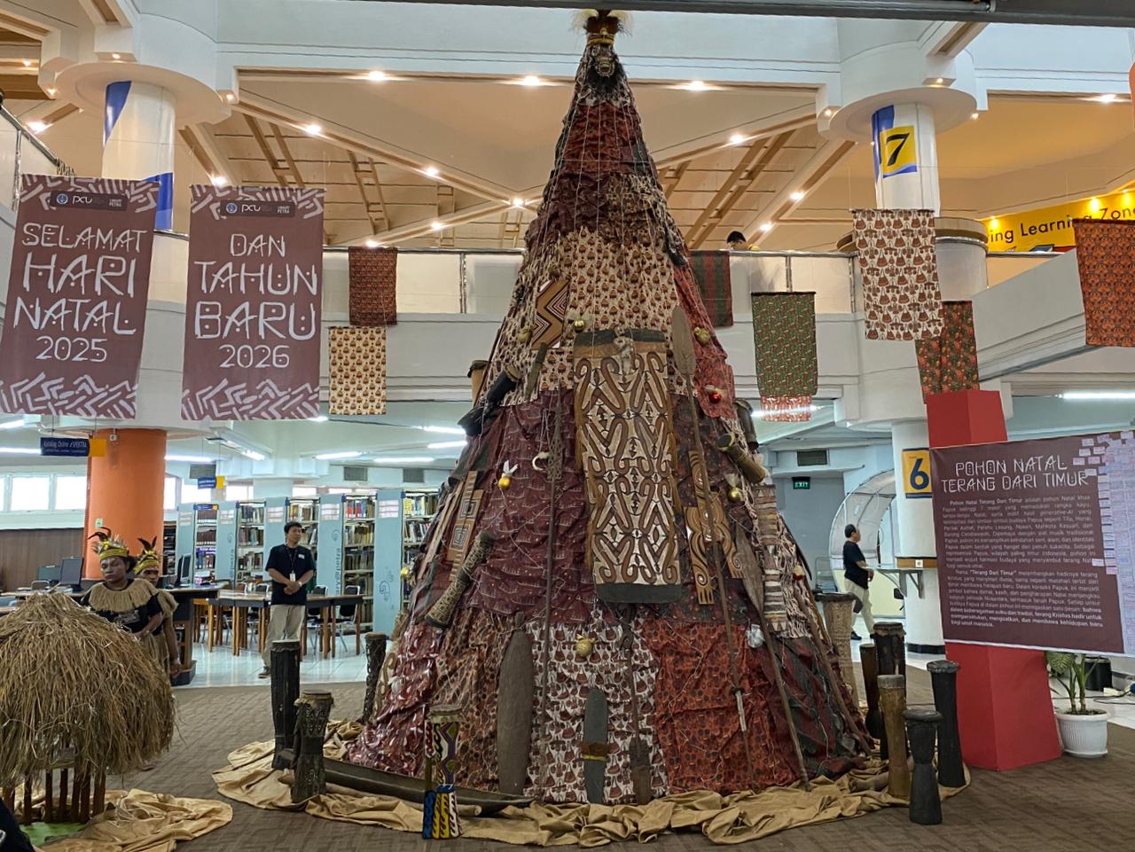 Pohon natal bernuansa Indonesia Timur itu berdiri megah di Perpustakaan lantai enam kampus PCU di Siwalankerto Surabaya, dan bisa dinikmati pengunjung hingga 31 Januari 2026.