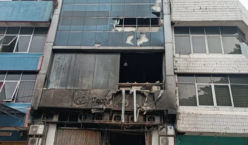 Ruko Terra Drone yang terbakar pada Selasa (9/12/2025) siang dan menyebabkan 22 orang meninggal dunia di Jakarta, Kamis (11/12/2025).Foto: Antara