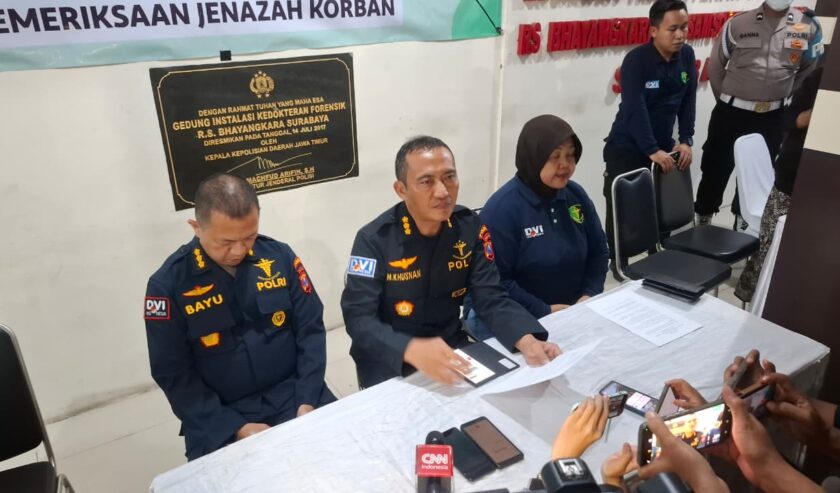 Kombes Pol M Khusnan Marzuki Kabiddokkes Polda Jatim saat konferensi pers menjelaskan identitas jenazah yang telah diidentifikasi, Minggu (5/10/2025). Foto: Akira suarasurabaya.net
