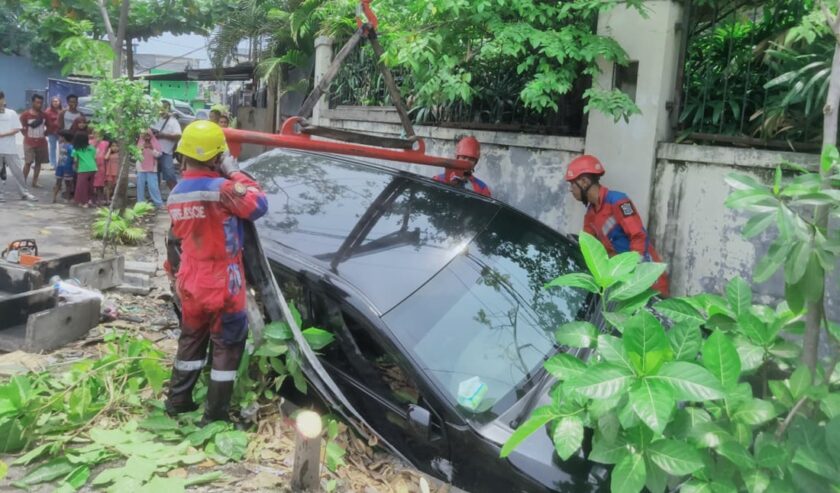 Petugas mengevakuasi mobil Sigra yang terperosok di saluran air kawasan Pawiyatan, Bubutan, Surabaya pada Minggu (26/10/2025). Foto: DPKP Surabaya