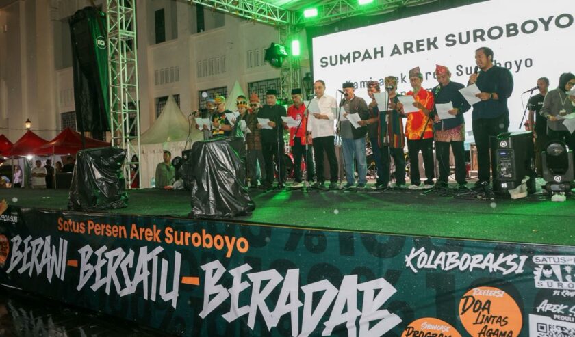 “Maka arek-arek Surabaya jangan pernah terprovokasi. Jangan pernah arek Surabaya diadu,” katanya dalam deklarasi Sumpah 100% Arek Suroboyo di Plaza Internatio, Senin (29/12/2025) malam.