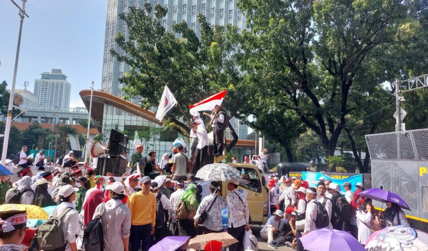 Ratusan guru madrasah dari berbagai organisasi dan daerah menggelar unjuk rasa di kawasan Monas, Jakarta Pusat, Kamis (30/10/2025). Foto: Farid suarasurabaya.net