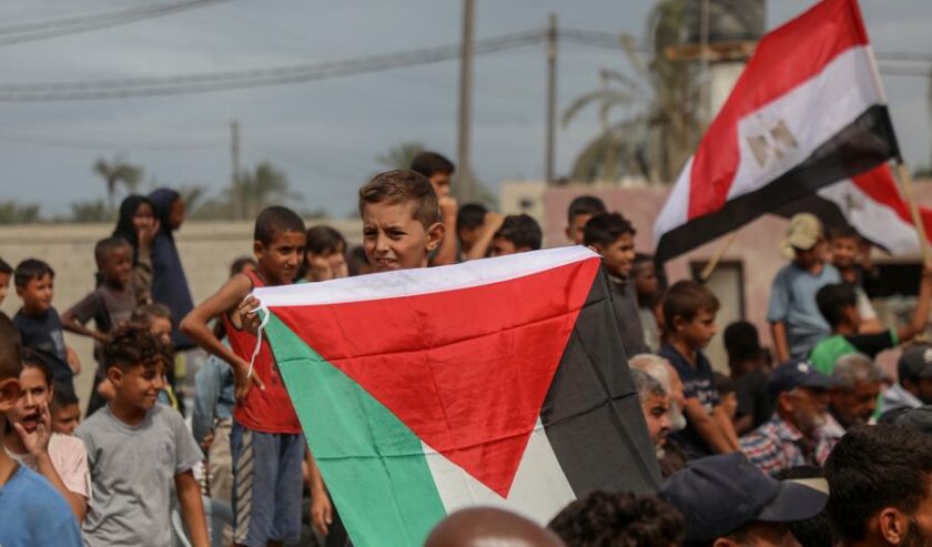 Warga Palestina berkumpul setelah pengumuman bahwa Israel dan Hamas telah menyetujui kesepakatan gencatan senjata Gaza di depan markas besar komite Mesir di Deir al-Balah, Jalur Gaza tengah, pada 9 Oktober 2025. Foto: Xinhua