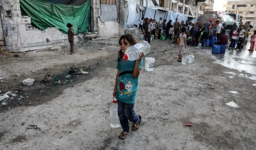 Seorang anak yang terlantar mengambil air dari sebuah tempat penampungan sementara di barat laut Kota Gaza, Palestina, Senin (25/8/2025). Foto: Antara