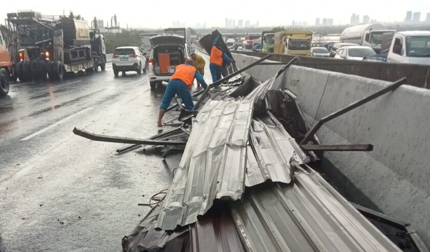 Hujan deras disertai angin kencang yang melanda Surabaya pada Rabu (22/10/2025) siang, menyebabkan sejumlah material bangunan terbang dan mendarat di sepanjang Tol Romokalisari-Tandes.