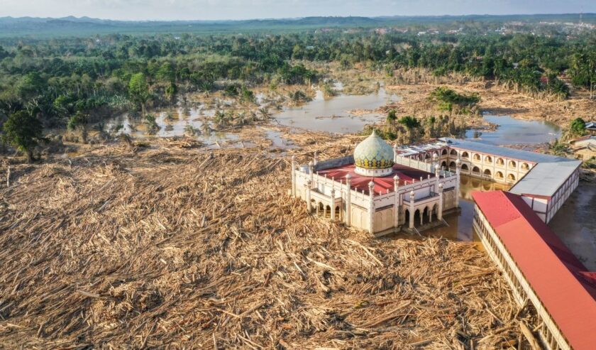 Kayu gelondongan yang terbawa banjir menutup area masjid dalam bencana banjir di Sumatra. Foto: ANTARA FOTO