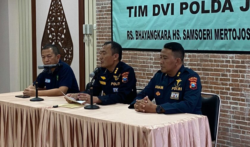(Tengah) Kombes Pol M Khusnan Marzuki Kabiddokkes Polda Jatim saat konferensi pers terkait identifikasi jenazah korban ambruknya Ponpes Al Khoziny, Senin (13/10/2025). Foto: Akira suarasurabaya.net