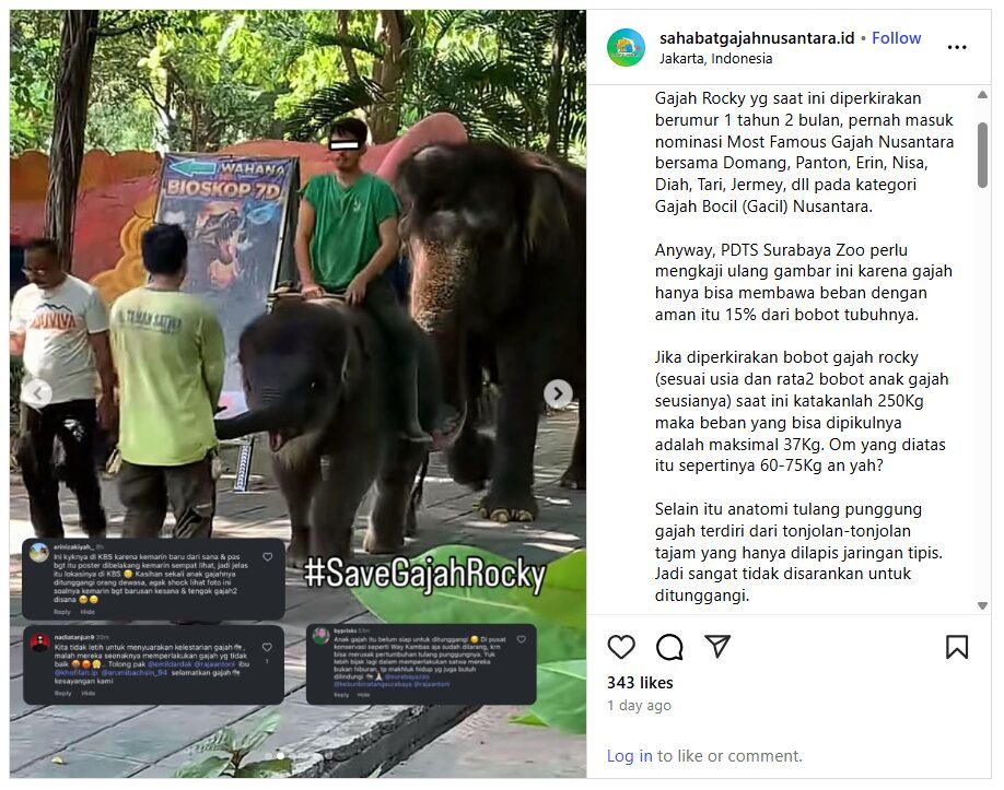 “Anak gajah Rocky baru berusia 1 tahun sekian bulan, maksimal berat tubuhnya 250 kilogram. Jadi bobot maksimal yang dia mampu bawa hanya 30 kilogram. Sedangkan manusia pasti di atasnya 50 kilogram kan?,” beberapa kalimat yang tercantum dalam caption. (lta/ris/iss)