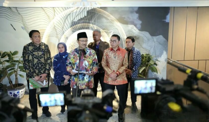 Saifullah Yusuf Menteri Sosial didampingi jajaran pejabat Kementerian Sosial memberikan keterangan pers usai menyerahkan berkas usulan 40 tokoh menjadi Pahlawan Nasional kepada Fadli Zon Menteri Kebudayaan sekaligus Ketua Dewan Gelar, Tanda Jasa, dan Tanda Kehormatan (GTK), di Kantor Kementerian Kebudayaan, Jakarta, Selasa (21/10/2025). Foto: Biro Humas Kemensos.