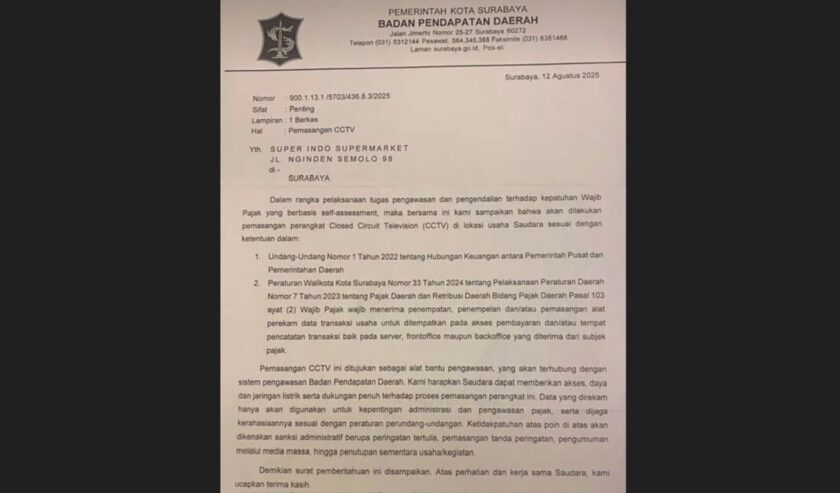 Dalam surat yang ditujukan ke salah satu supermarket itu, Bapenda Surabaya menyebut pemasangan CCTV di lokasi usaha dilakukan dalam rangka pelaksanaan tugas pengawasan dan pengendalian terhadap kepatuhan wajib pajak yang berbasis self-assessment.