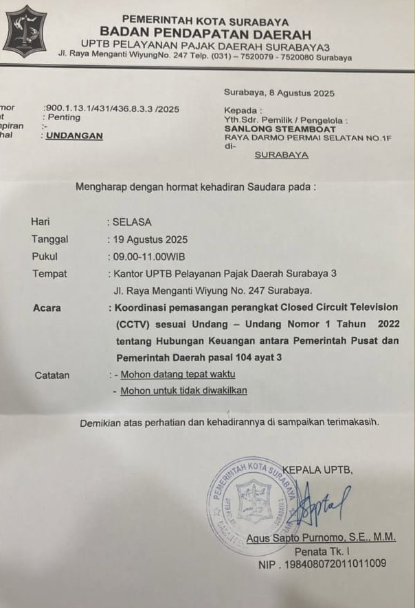 Surat dari Badan Pendapatan Daerah (Bapenda) Kota Surabaya kepada salah satu pelaku usaha terkait undangan koordinasi pemasangan Closed Circuit Television (CCTV) di tempat usaha oleh pemerintah. Foto: Instagram/ferrysch