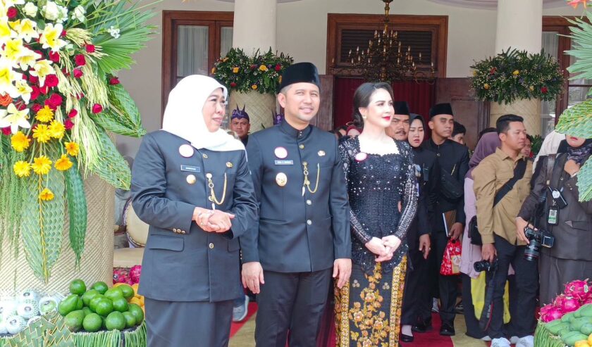 Khofifah Indar Parawansa Gubernur Jatim (kiri) bersama Emil Elestianto Dardak Wagub Jatim (kanan) dan Arumi Bachsin Ketua PKK Jatim dalam HUT ke-80 Jatim di Gedung Negara Grahadi, Minggu (12/10/2025). Foto: Wildan suarasurabaya.net