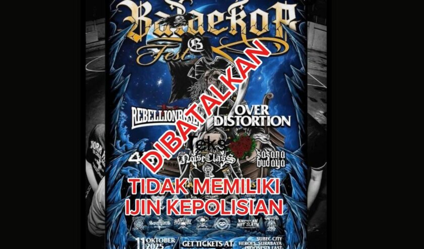 Sebuah acara konser musik yang rencananya digelar di Jalan Kusuma Bangsa Nomor 14, Surabaya, Sabtu (11/10/2025) malam nanti, resmi dibatalkan oleh pihak kepolisian.