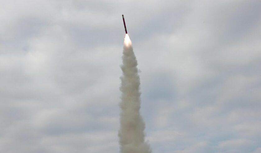 Foto yang dipublikasikan Kantor Berita Pusat Korea (KCNA) pada 29 Oktober 2025, menunjukkan Korea Utara sedang menguji coba rudal jelajah strategis laut-ke-permukaan di Laut Kuning sehari sebelumnya.