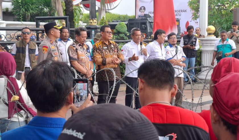 Massa aksi yang melakukan unjuk rasa di depan Kantor Gubernur Jawa Timur (Jatim), akhirnya membubarkan diri dengan tertib setelah ditemui oleh Sigit Priyanto Kepala Dinas Tenaga Kerja dan Transmigrasi (Kadisnakertrans) Jatim, Kamis (30/10/2025).