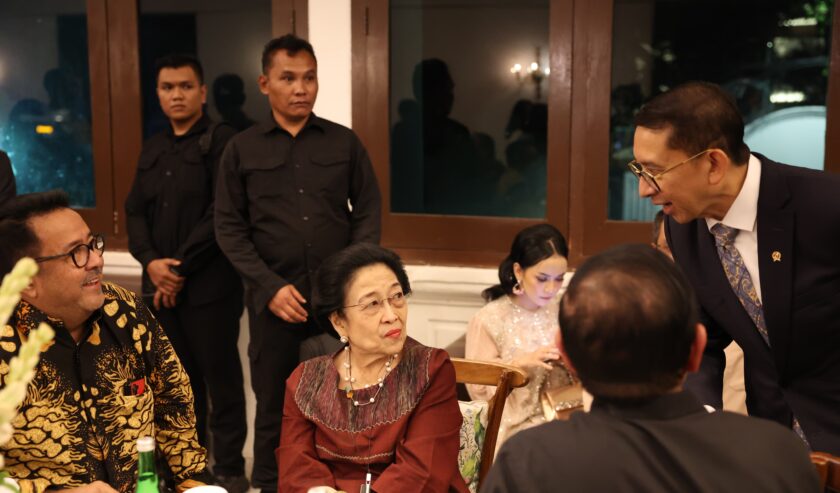 Sebelum dimulainya pertunjukan, Megawati menyempatkan berbincang ringan dengan Fadli Zon Menteri Kebudayaan di ruang tunggu.