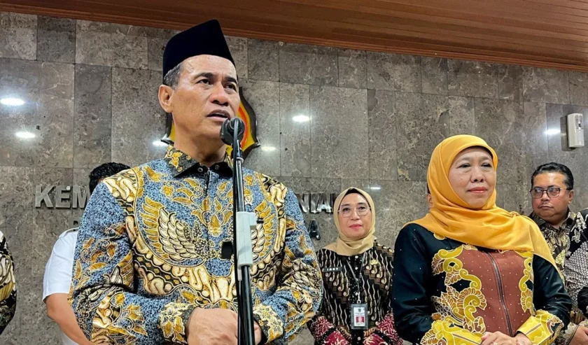 Andi Amran Sulaiman (kiri) Menteri Pertanian) dan Khofifah Indar Parawansa (kanan) Gubernur Jawa Timur, dalam jumpa pers di Jakarta, Jumat (28/11/2025). Foto: Antara