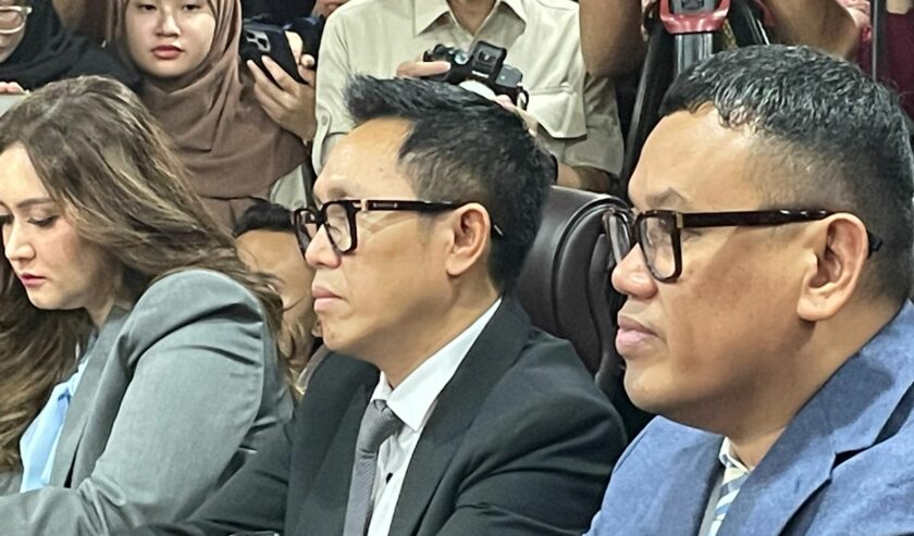 Surya Utama atau Uya Kuya (kanan) anggota DPR Fraksi PAN bersama Eko Hendro Purnomo dan Nafa Urbach saat mengikuti sidang pembacaan putusan MKD DPR RI, Rabu (5/11/2025). Foto: Faiz Fadjarudin suarasurabaya.net