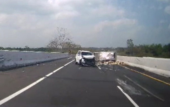 Tangkap layar kecelakaan yang melibatkan dua kendaraan di KM 60.800 Tol Pandaan-Malang pada Rabu (15/10/2025). Foto: Alexander via WA SS