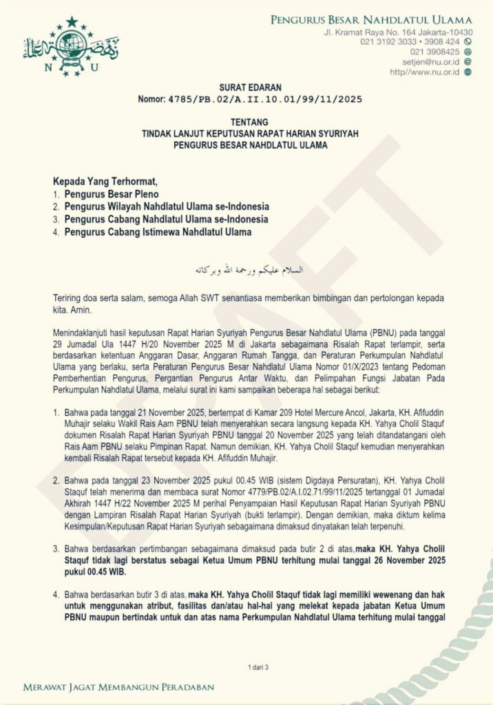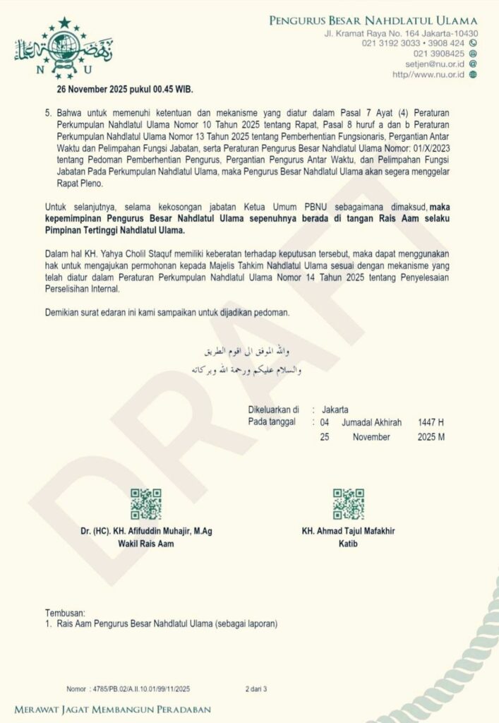 “KH Yahya Cholil Staquf tidak lagi berstatus sebagai Ketua Umum PBNU terhitung mulai 26 November 2025 pukul 00.45 WIB,” demikian isi surat tersebut.