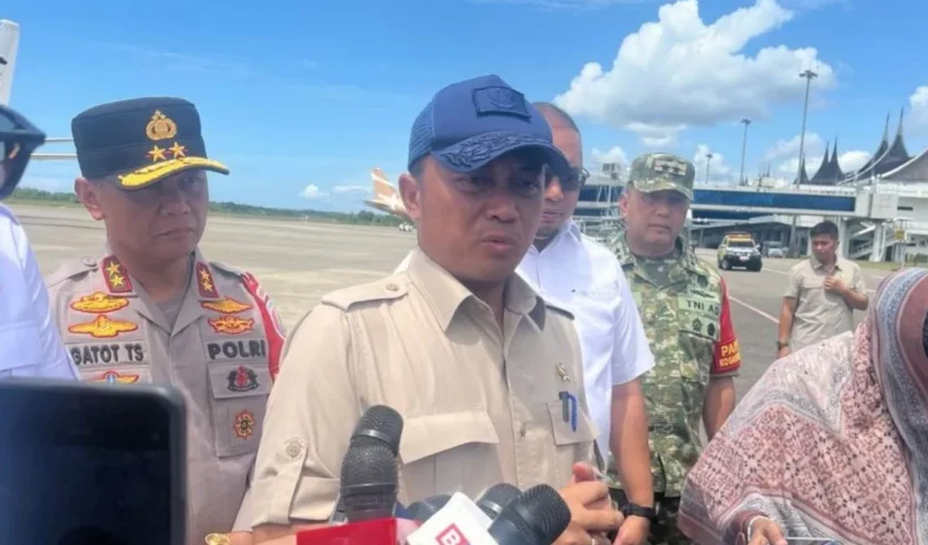 Prasetyo Hadi Menteri Sekretaris Negara memberikan keterangan pers di Bandara Internasional Minangkabau, Padang Pariaman, Sumatera Barat, Kamis (18/12/2025). Foto: Antara