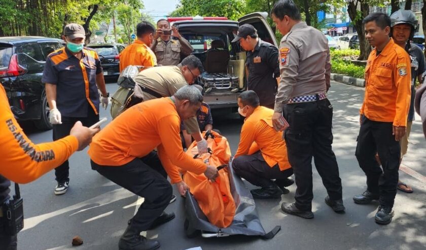Petugas mengevakuasi jenazah pemotor yang meninggal dunia akibat kecelakaan di Jalan Raya Bratang Binangun, Surabaya, Rabu (20/8/2025) pagi. Foto: Command Center 112 Surabaya