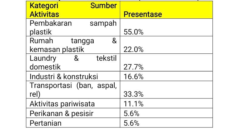 “55 persen sumber mikroplastik di udara berasal dari kegiatan pembakaran sampah plastik, sedangkan sektor transportasi menyumbang 33 persen, disusul kegiatan laundry dan tumpukan sampah kemasan yang tak terkelola,” katanya, pada Sabtu (25/10/2025).