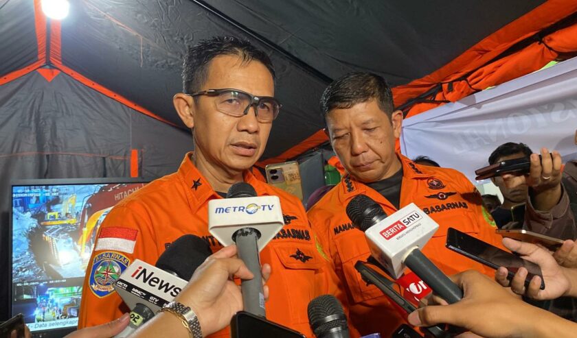 Laksamana Pertama TNI Yudhi Bramantyo Direktur Operasi pencarian dan Pertolongan Basarnas saat konferensi pers di Posko Gabungan, Minggu (5/10/2025). Foto: Wildan suarasurabaya.net