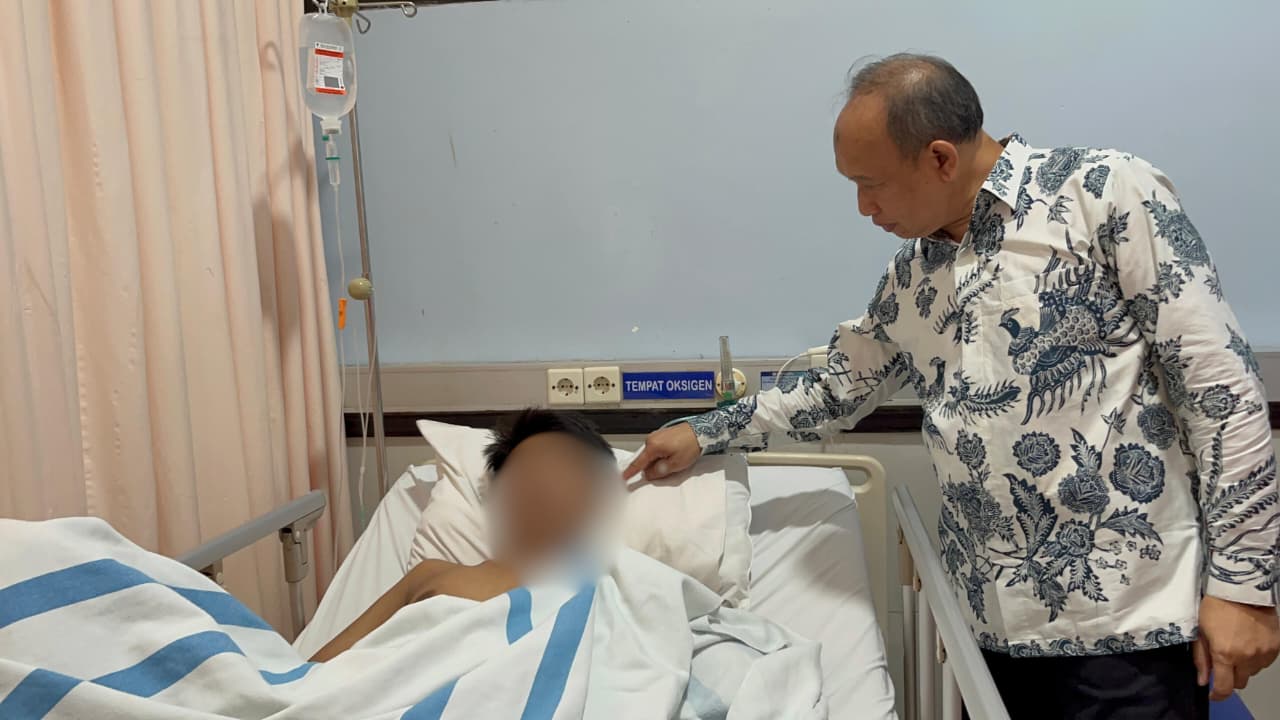 Dokter Atok Irawan Direktur Utama RSUD R.T. Notopuro Sidoarjo saat menjenguk Nur Ahmad korban tertimpa reruntuhan musala Ponpes Al Khoziny yang terpaksa diamputasi saat evakuasi, Rabu (1/10/2025). Foto: Meilita Elaine suarasurabaya.net