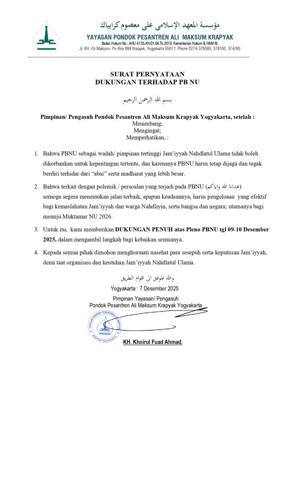 Pimpinan/Pengasuh Pondok Pesantren Ali Maksum Krapyak, Yogyakarta, mendukung penyelenggaraan Rapat Pleno Pengurus Besar Nahdatul Ulama (PBNU) pada 9-10 Desember 2025.