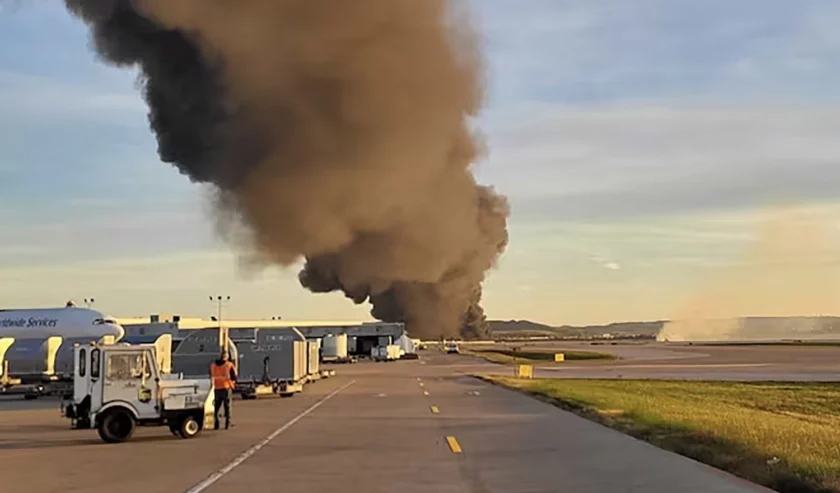Beberapa ledakan terjadi di lokasi akibat kebakaran besar yang melibatkan sekitar 38.000 galon bahan bakar pesawat.