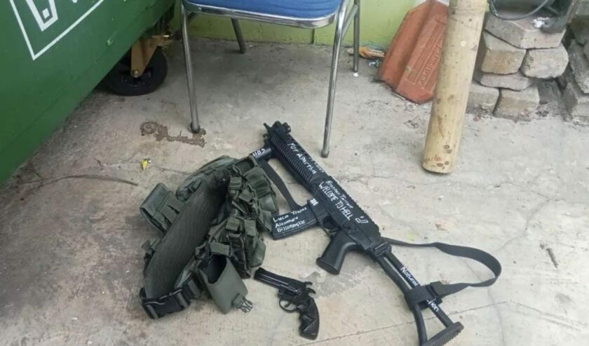 Dari lokasi kejadian, Polisi antara lain menemukan senjata mainan berbentuk senapan dengan berbagai tulisan, dan pistol milik terduga pelaku teror.