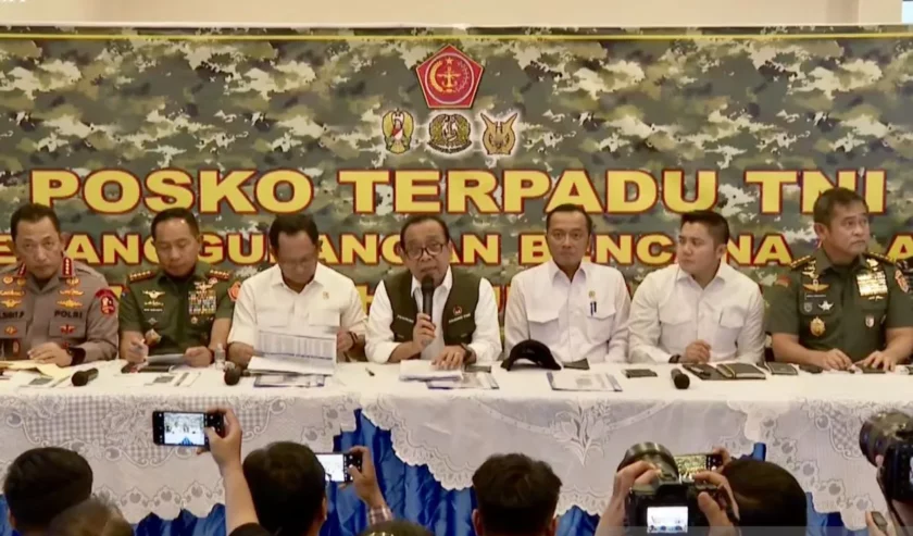 Pratikno Menteri Koordinator Bidang Pembangunan Manusia dan Kebudayaan (Menko PMK) (tengah) memimpin jumpa pers di Posko Bantuan Bencana Sumatra Lanud Halim Perdanakusuma, Jakarta, Rabu (3/12/2025). Foto: Antara