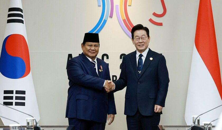 Prabowo Subianto Presiden RI dan Lee Jae Myung Presiden Korea Selatan melakukan pertemuan bilateral di sela KTT APEC 2025, Gyeongju, Korea Selatan, Sabtu (1/11/2025). Foto: Yonhap