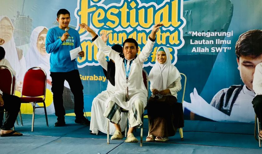 Salah satu peserta lomba cerdas cermat selebrasi ketika berhasil menjawab pertanyaan dengan benar dalam rangkaian Festival Tunanetra Mengaji di Monumen Kapal Selam (Monkasel) Surabaya, Sabtu (25/10/2025). Foto: Dimas Tri Agung Mg suarasurabaya.net