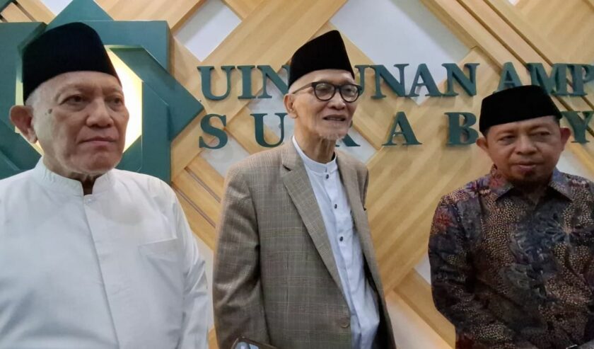 KH Miftachul Akhyar Rais Aam PBNU (tengah) saat ditemui awak media di UINSA Surabaya, Kamis (13/11/2025). Foto: Wildan suarasurabaya.net