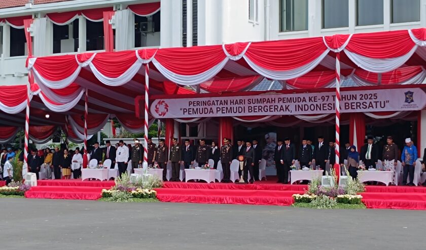 Pemerintah Kota (Pemkot) Surabaya memperingati Hari Sumpah Pemuda dalam rangkaian upacara peringatan di halaman Balai Kota Surabaya, pada Selasa (28/10/2025).