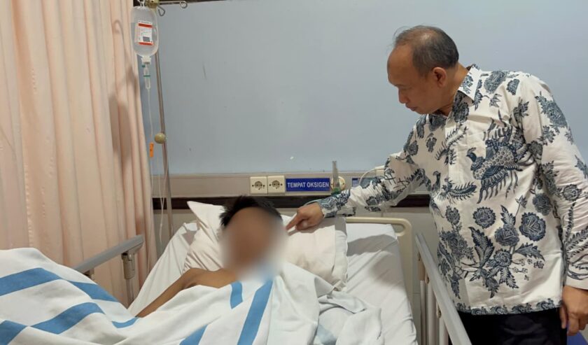 Dokter Atok Itawan Direktur Utama RSUD R.T. Notopuro Sidoarjo saat menjenguk Nur Ahmad korban tertimpa reruntuhan musala Ponpes Al Khoziny yang terpaksa diamputasi saat evakuasi, Rabu (1/10/2025). Foto: Meilita Elaine suarasurabaya.net