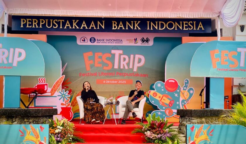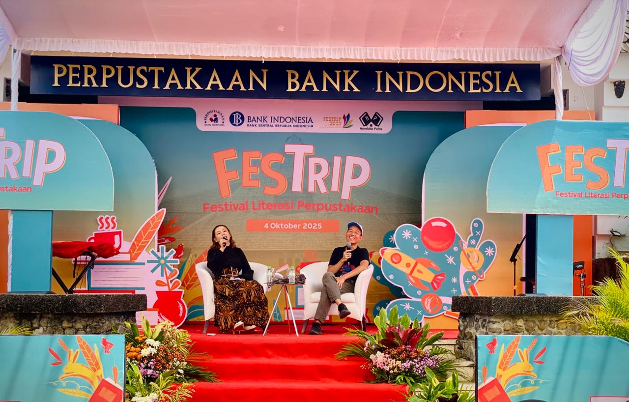 Tere Liye penulis novel yang telah menghasilkan lebih dari 60 karya, hadir dalam acara Festival Literasi Perpustakaan (FESTRIP) yang diselenggarakan oleh Bank Indonesia di Perpustakaan Bank Indonesia (BI) Surabaya, Sabtu (4/10/2025).