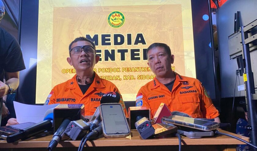 Laksamana Pertama TNI Yudhi Bramantyo Direktur Pencarian dan Pertolongan Basarnas saat konferensi persi di Posko Gabungan, Rabu (1/10/2025) malam. Foto: Wildan suarasurabaya.net