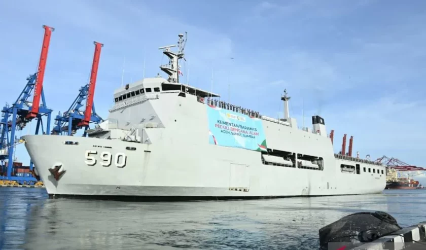 KRI Makasar-590 yang akan membawa personel Zeni Marinir saat bersandar di pelabuhan Kolinlamil Jakarta Utara, Selasa (16/12/2025). Foto: Antara