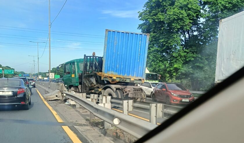Sebuah truk kontainer menabrak guardrail atau pembatas jalan di ruas Tol Perak arah Waru, yang menyebabkan kemacetan panjang pada, Senin (22/12/2025) pagi.
