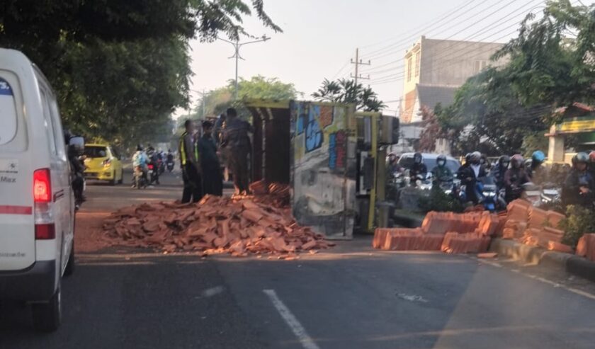 Truk bermuatan genting terguling di kawasan Buduran, Sidoarjo pada Rabu (15/10/2025). Foto: Anton via WA SS