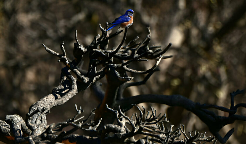 Seekor burung Western Bluebird bertengger di dahan pohon yang hangus terbakar setelah Kebakaran Eaton di Altadena, California pada tanggal 14 Januari 2025. Foto: AFP via Getty Images