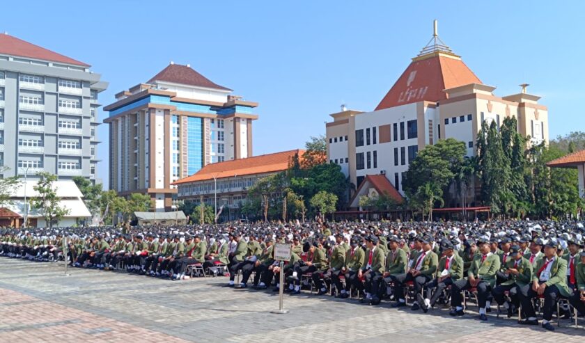 Ribuan mahasiswa baru dalam Pengenalan Kehidupan Kampus bagi Mahasiswa Baru (PKKMB) tahun akademik 2025/2026 di halaman menara Wiyama Twin Tower, UPN Veteran Jatim, pada Sabtu (16/8/2025). Foto: Risky suarasurabaya.net